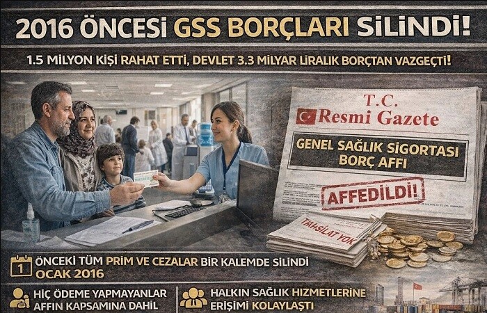 Resmi Gazete'de Yayımlandı: 2016 Öncesi GSS Borçları Silindi 11. Yargı Paketi’nin Resmî Gazete’de yayımlanarak yürürlüğe girmesiyle, 1 Ocak 2016 tarihinden önceye ait ödenmemiş Genel Sağlık Sigortası prim borçları ile bunlara bağlı gecikme cezası ve zamların tamamı silindi. Yaklaşık 1,5 milyon kişiyi kapsayan düzenleme ile milyarlarca liralık borç yükünün ortadan kalkması öngörülüyor.