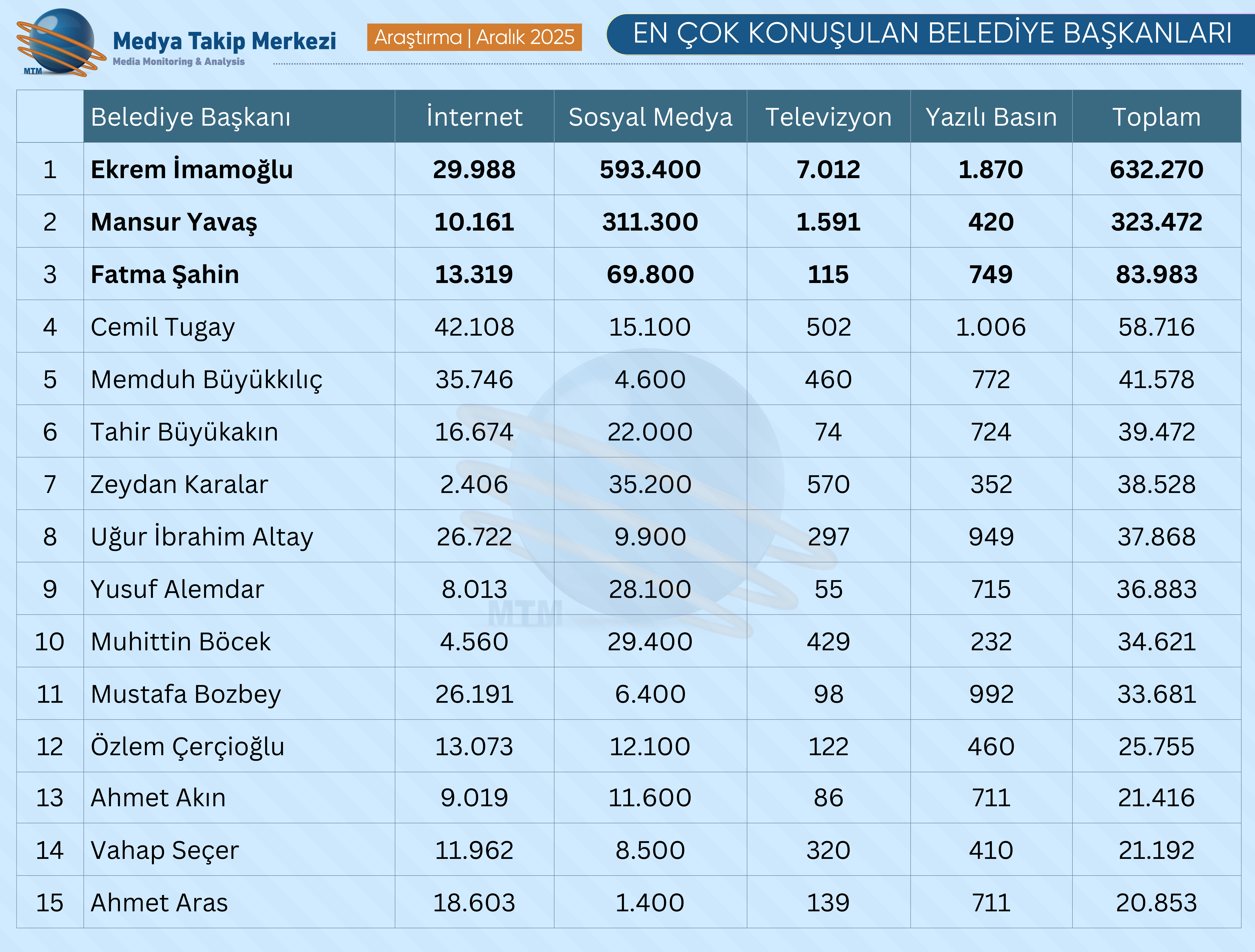 | MTM Medya Takip Merkezi, Aralık 2025’te en çok konuşulan belediye başkanlarını araştırdı. Ekrem İmamoğlu, Mansur Yavaş ve Fatma Şahin ay boyunca en çok konuşulan belediye başkanları oldu. | ||
