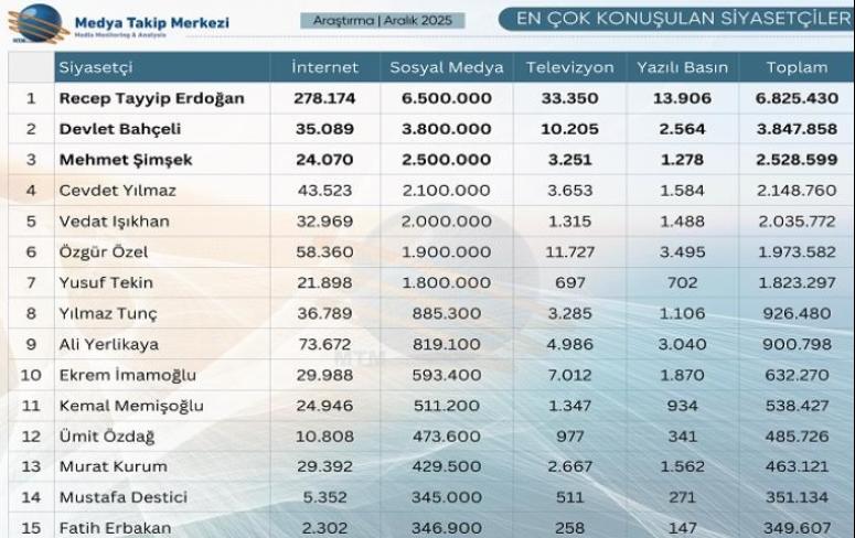 | MTM Medya Takip Merkezi, Aralık 2025'in en çok konuşulan siyasetçiler Cumhurbaşkanı Recep Tayyip Erdoğan, Devlet Bahçeli, Mehmet Şimşek, Ali Yerlikaya ve Özgür Özel ay boyunca öne çıkan isimler oldu. | ||