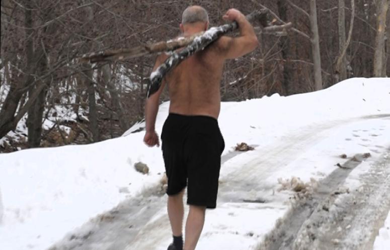 Karlı günlerde de üzerinde sadece şortuyla doğada dolaşan Aydın, karlı yolları aşarak yakacak odun topluyor. Uzun yıllardır bu şekilde yaşadığını belirten Aydın, üşümediğini ve hastalanmadığını ifade ediyor.