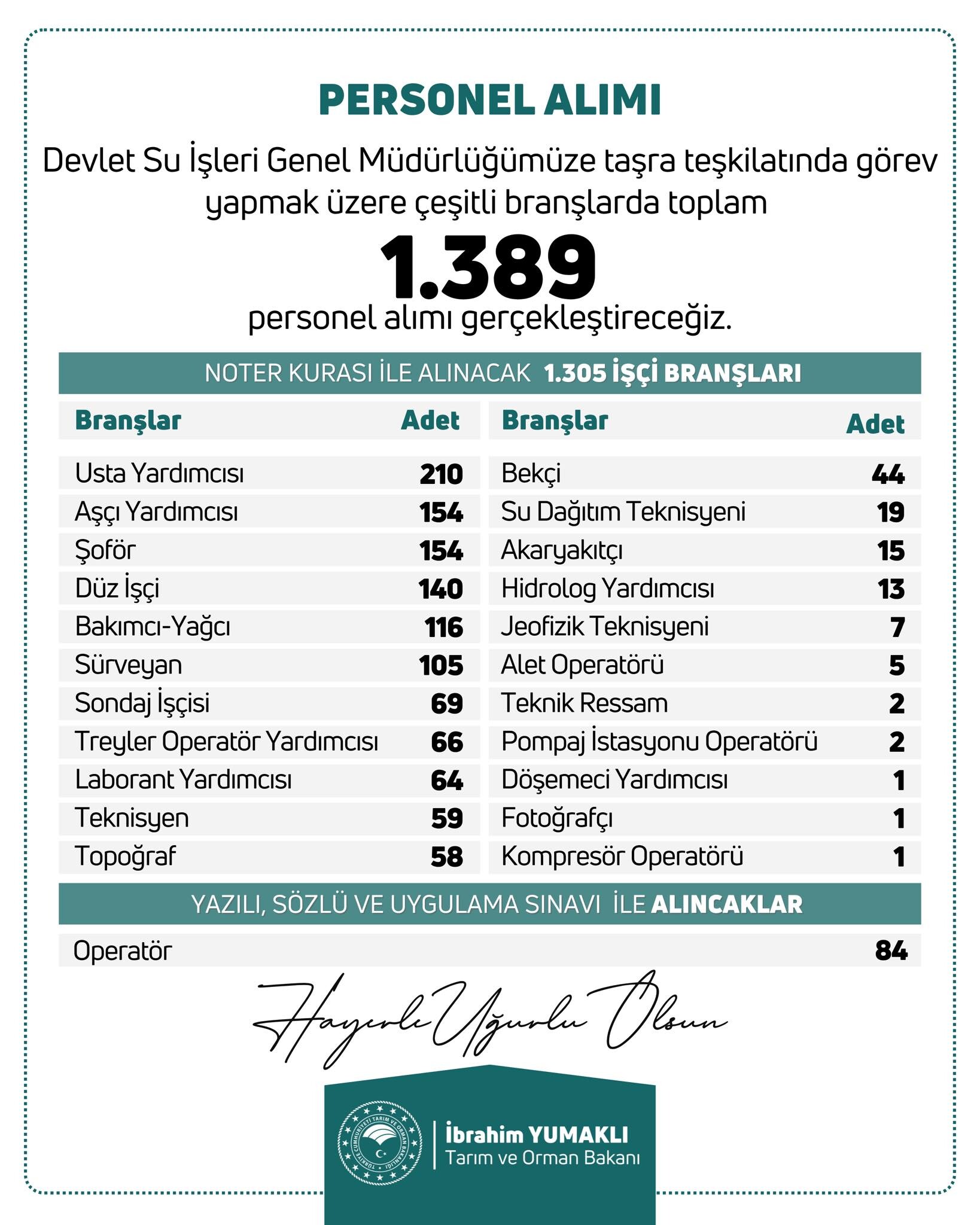 Tarım ve Orman Bakanı İbrahim Yumaklı’nın imzasını taşıyan duyuruda, yeni alınacak personelin ülkenin dört bir yanında su kaynaklarının yönetimi, baraj, sulama ve taşkın koruma projelerinde görev alacağı belirtildi. Bakan Yumaklı, “Ülkemizin dört bir yanında görev alacak yeni çalışma arkadaşlarımıza şimdiden kolaylıklar diliyorum. Hayırlı uğurlu olsun.” ifadelerine yer verdi.