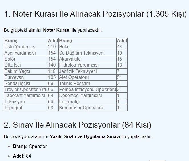 Açık pozisyonlar ve alım sayıları şu şekilde: Elektrik-Elektronik Teknisyeni: 1 kişi Aşçı Yardımcısı: 2 kişi Kimya Laboratuvarı Görevlisi: 2 kişi Usta Yardımcısı: 1 kişi Makine Teknisyeni: 1 kişi Sondaj İşçisi: 1 kişi Şoför-Yük Taşıma: 2 kişi İnşaat Sürveyanı: 4 kişi Topoğraf: 2 kişi Tır-Çekici Şoförü: 2 kişi Beden İşçisi (Genel): 2 kişi Ekskavatör (Kazıma ve Yükleme) Operatörü: 1 kişi Yükleyici (Loder) Operatörü: 1 kişi İş Makineleri Yağcısı: 1 kişi