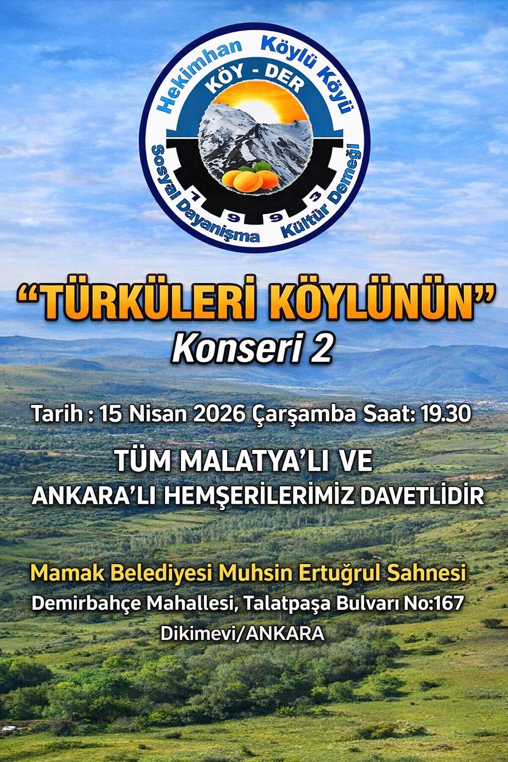 | KÖY-DER Hekimhan Köylüköyü Sosyal Dayanışma ve Kültür Derneği, “Türküler Köylünün” Konserinin 2. Ankara Mamak'ta Düzenliyor! | ||