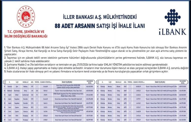 İller Bankası Anonim Şirketine ait 88 adet arsa satışa sunuldu. İstanbul, Balıkesir, Aydın, İzmir, Antalya, Muğla, Adana, Mersin, Denizli, Ankara, Samsun ve Kütahya illerinde bulunan arsaların satış ihalesi 27 Ocak 2026 tarihinde saat 10:30'da gerçekleştirilecek.