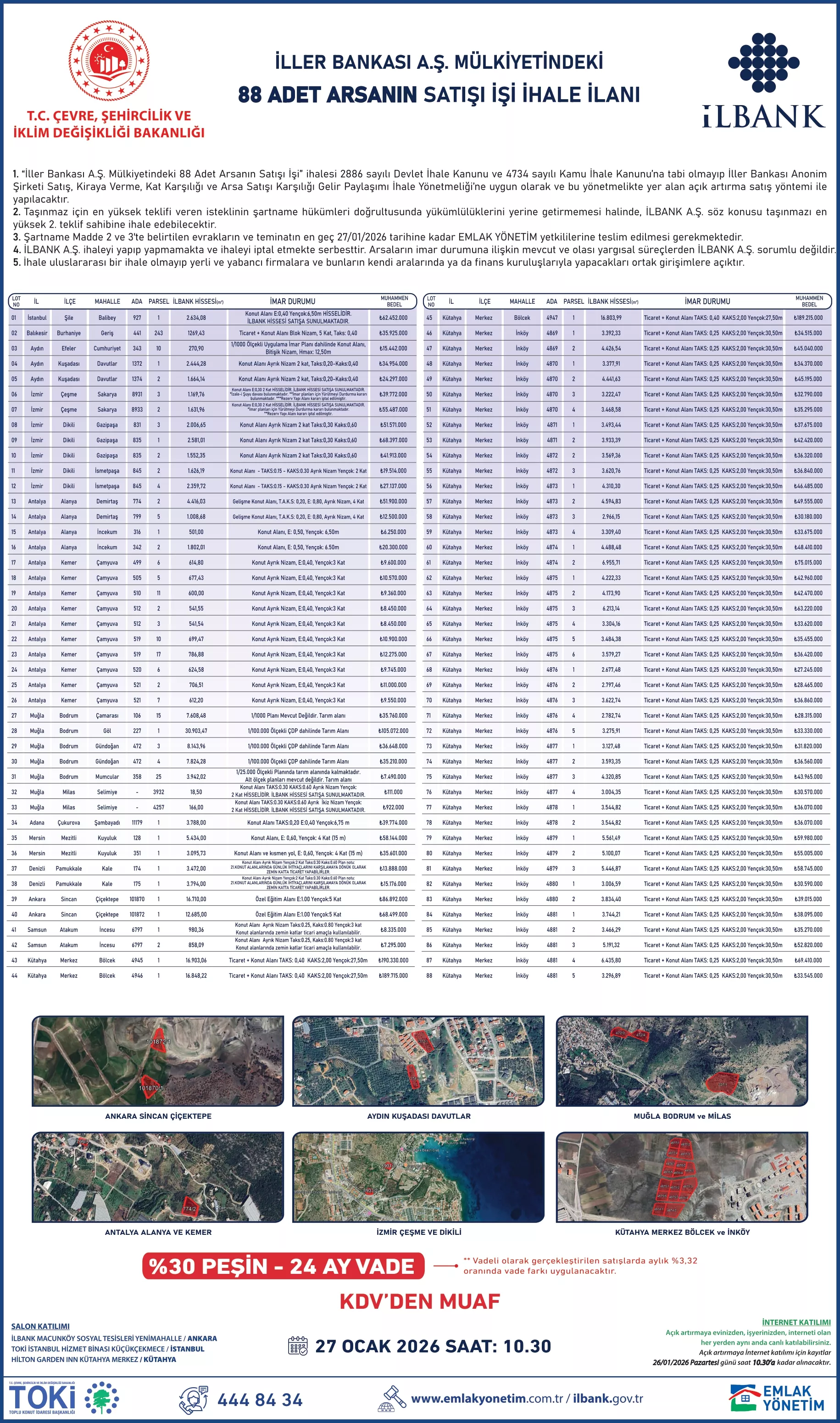 | İller Bankası Anonim Şirketine Ait 12 İlde 88 Muhtelif Arsa 27 Ocak 2026 Tarihinde Saat 10:30'da Satışa Sunuldu. | ||