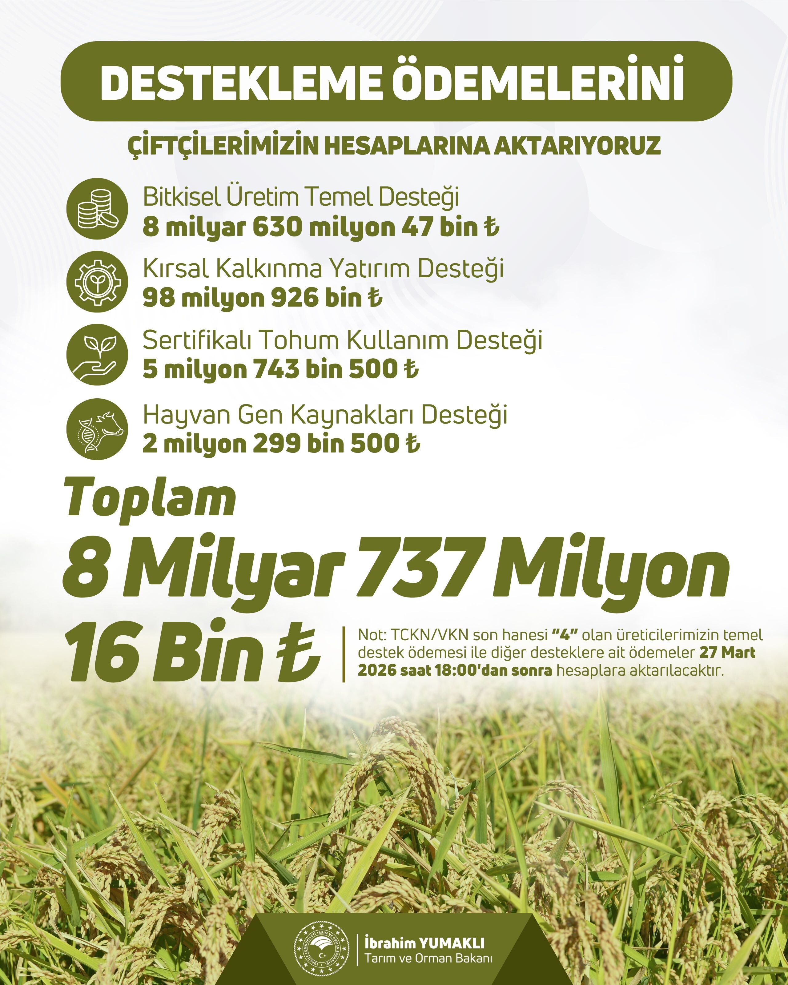Bakan Yumaklı yaptığı açıklamada; “Alın terine değer, toprağa bereket katmak için üreticilerimizi destekliyoruz. 8 milyar 737 milyon TL tarımsal destek ödemesini çiftçilerimizin hesaplarına aktarıyoruz. Hayırlı ve bereketli olsun" ifadelerini kullandı.