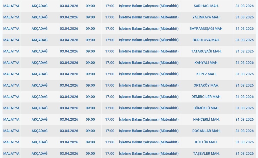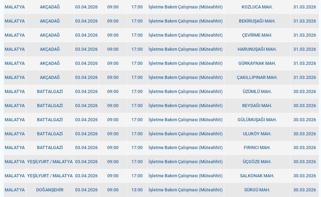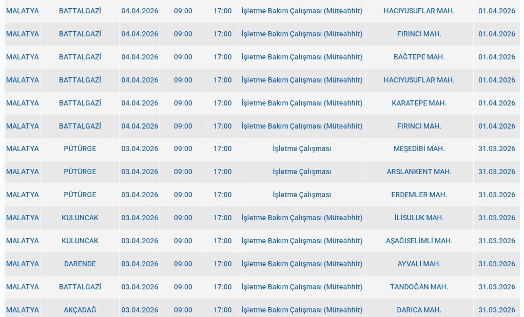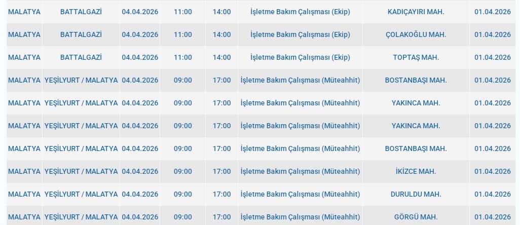 | 3 - 4 Nisan Cuma ve Cumartesi Günü Saat 09.00 İle 17.00 Arası Akçadağ, Battalgazi, Darende, Kuluncak, Pütürge ve Yeşilyurt Planlı Bakım Çalışmaları Nedeniyle Elektrik Kesintisi Yaşanacak. | ||