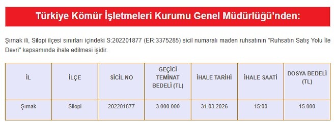 Türkiye Kömür İşletmeleri Kurumu Genel Müdürlüğü, Şırnak ili Silopi ilçesinde bulunan maden sahasının ruhsat hakkı devri yöntemiyle satışını ihale edecek.