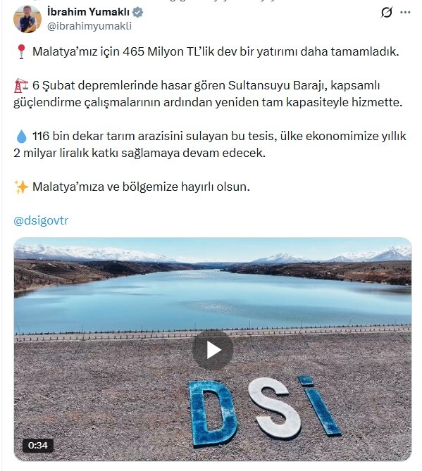 Tarım ve Orman Bakanı İbrahim Yumaklı, Malatya’da depremde zarar gören Sultansuyu Barajı’na ilişkin yürütülen çalışmaların tamamlandığını duyurdu. Yapılan açıklamada, toplam 465 milyon TL’lik yatırım kapsamında barajın kapsamlı şekilde güçlendirilerek yeniden hizmete alındığı belirtildi.