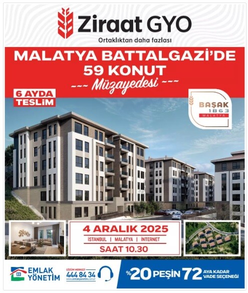 Ziraat GYO Battalgazi'de 59 Konutu Satışa Çıkarıldı Ziraat Gayrimenkul Yatırım Ortaklığı A.Ş Battalgazi'de 59 Konutu 4 Aralık 2025 Günü Saat 10:30’da internet Üzerinden Satışa Çıkardı.