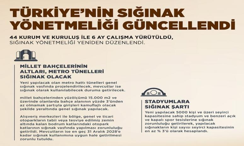 44 farklı kurum ve kuruluş ile iş birliği içinde yürütülen çalışmalar 6 ayda tamamlandı. Yönetmelik değişikliği ile ilgili sosyal medya hesabından paylaşım yapan Çevre, Şehircilik ve İklim Değişikliği Bakanı Murat Kurum, “Ülkemizin sığınak yönetmeliğini günümüz ihtiyaç ve koşullarına uygun hale getirerek güncelledik. Mevcut sığınaklara denetim şartı ve ilave standartlar, yeni yapılacak binalara önemli koşullar getirdik. Resmi Gazete’de yayımlanan yönetmeliğimizle; millet bahçeleri, metro tünelleri gibi alanları sığınak hizmeti verecek şekilde düzenleyeceğiz. Milletimizin huzur ve güveni için gereken her adımı atmaya devam edeceğiz.