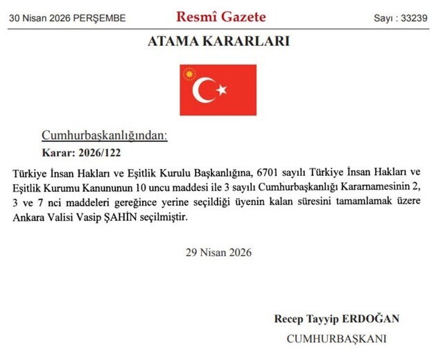 ANKARA VALİSİ ŞAHİN, TİHEK BAŞKANLIĞINA SEÇİLDİ Ankara Valisi Vasip Şahin, Türkiye İnsan Hakları ve Eşitlik Kurulu (TİHEK) Başkanlığına getirildi. Cumhurbaşkanı Recep Tayyip Erdoğan'ın imzasıyla Resmi Gazete'de yayımlanan atama kararlarına göre, TİHEK Başkanlığına Vasip Şahin seçildi.