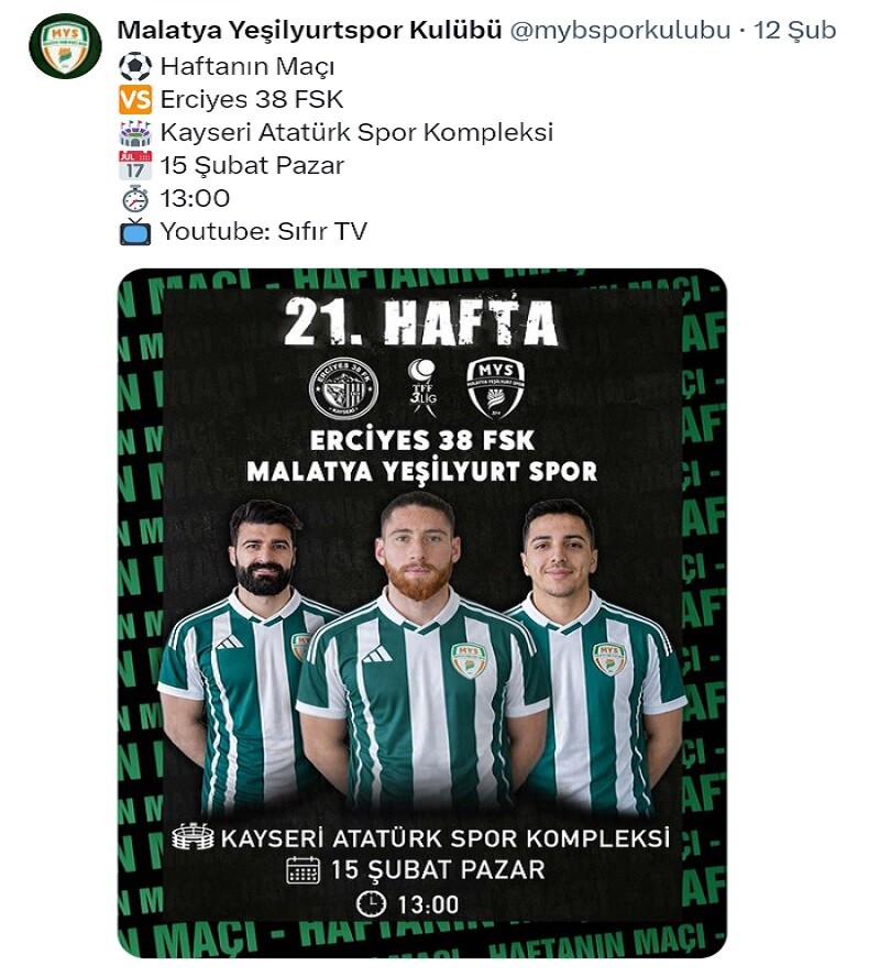 TFF 3. Lig 2. Grup 21. Hafta Maçında Malatya Yeşilyurtspor Kayseri Deplasmanında Erciyes 38 FSK İle 15 Şubat Pazar Günü Saat 13.00'da Karşı Karşıya Gelecek. TFF 3. Lig 2. Grup 21. Hafta Maç Programı