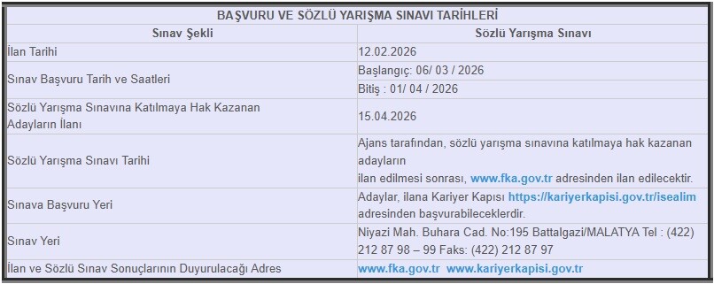 Fırat Kalkınma Ajansından Personel Alım İlanı Düzeltme İlanına Git 12 Şubat 2026 tarih ve 33166 sayılı Resmî Gazete’de aslına uygun olarak yayımlanan “Fırat Kalkınma Ajansı Personel Alım İlanı” başlıklı ilanda belirtilen son başvuru tarihi 01.04.2026 ve sözlü sınava katılacakların ilan tarihi 15.04.2026 olarak aşağıdaki şekilde güncellenmiştir.