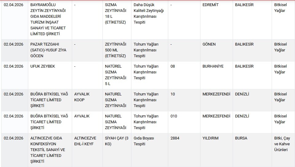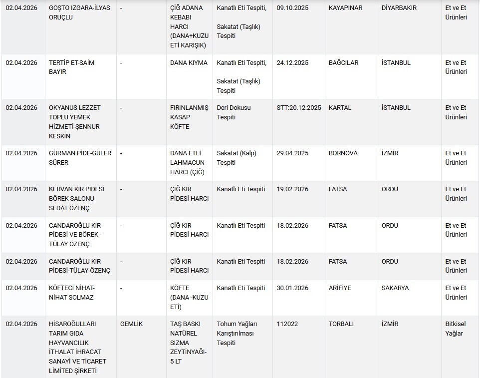 Bakanlığın paylaştığı verilere göre tespit edilen bazı usulsüzlükler şunlar: Dana Kıyma: Bir markanın “dana kıyma” etiketiyle satışa sunduğu üründe kanatlı eti tespit edildi. Siyah Çay: Bir firmanın sattığı siyah çayda gıda boyası kullanıldığı belirlendi. İlaç Etken Maddesi: İstanbul’un Kağıthane ilçesinde faaliyet gösteren bir firmanın ürettiği orman meyveli çayda ilaç etken maddesi bulunduğu saptandı.