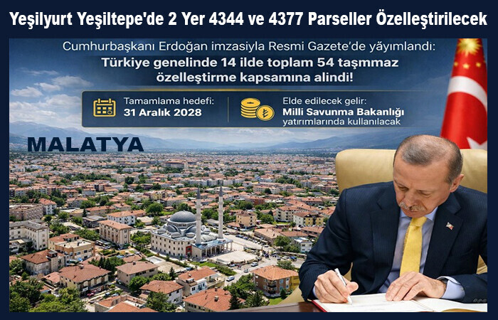 Mülkiyeti Maliye Hazinesi Adına Kayıtlı Malatya'da Yeşilyurt Yeşiltepe'de 2 Yer 4344 ve 4377 Parsel Olmak Üzere 14 İldeki 54 Taşınmazın Özelleştirme Kapsamına ve Programına Alınması Kararlaştırıldı.